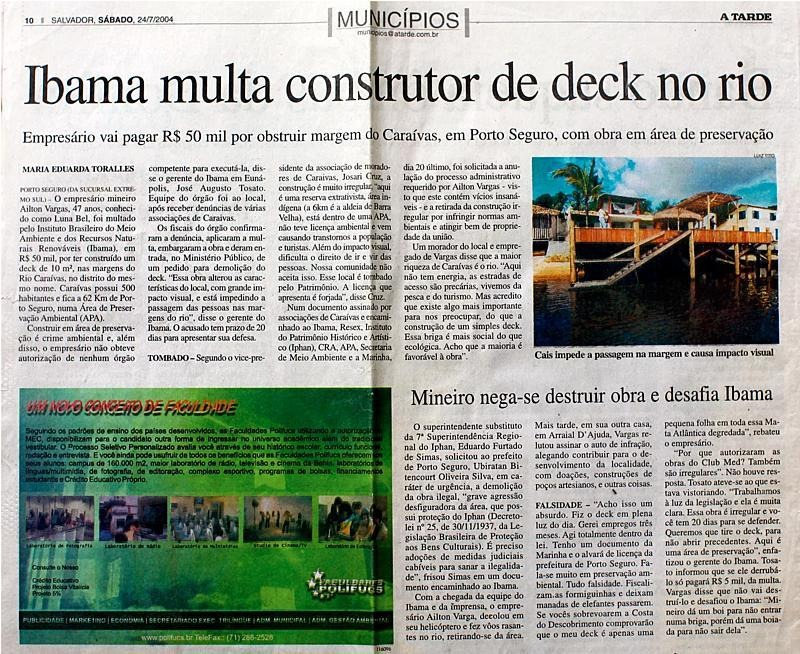 A situação jurídica de um segundo deck em Caraíva está no centro de um impasse legal que envolve diversos órgãos ambientais e urbanos. Desde 2004, o deck foi multado pelo Instituto Brasileiro do Meio Ambiente e dos Recursos Naturais Renováveis (IBAMA), mas ainda existem recursos pendentes, o que faz com que o caso esteja em fase de agravo, aguardando uma decisão final sobre a demolição.